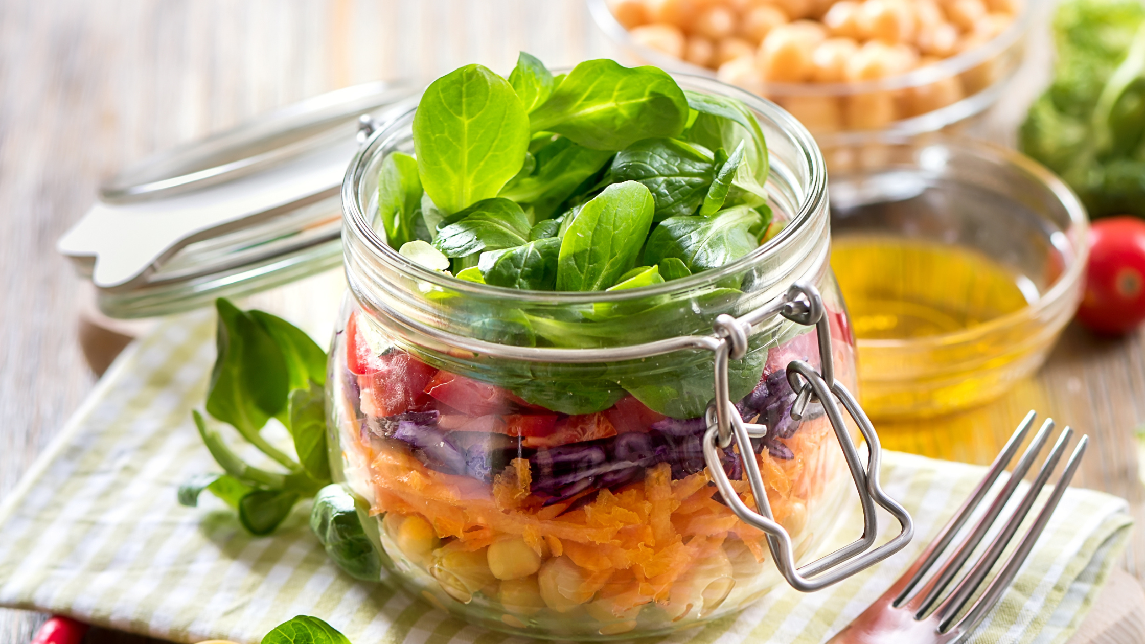1. In your Mason jar, layer scrambled eggs, feta cheese, and chopped baby spinach.